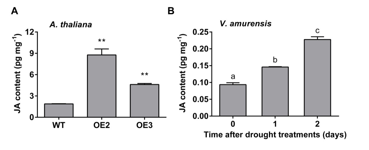 中国科学院植物种质创新与特色农业重点实验室园艺作物生物学课题组在李绍华研究员和辛海平副研究员的指导下,从原产于我国东北的抗寒旱种质资源山葡萄(Vitis amurensis)中克隆了NAC家族基因VaNAC26,并对VaNAC26在非生物胁迫中的功能以及可能的调控机制进行了研究。结果表明,VaNAC26在干旱、低温以及高盐胁迫下均显著上调。在拟南芥中过表达VaNAC26可显著提高植株的抗旱性和抗盐性,而抗旱性表型最为突出。进一步研究发现,该基因可提高植株在干旱胁迫下活性氧清除能力。对转基因拟南芥microarray芯片分析发现,茉莉酸(JA)合成关键基因以及JA信号通路相关基因均有显著上调,说明VaNAC26具有提高JA合成及其信号通路的能力。而过表达VaNAC26的拟南芥在正常状态下叶片JA含量均显著高于野生型,说明该基因可能通过提高JA合成途径调控植物耐旱性。另外,在干旱条件下山葡萄叶片中JA含量同样显著上升,说明山葡萄的内源JA同样参与了其干旱胁迫应答。