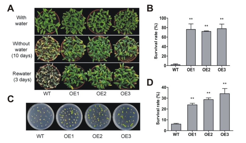 过表达VaNAC26 显著提高拟南芥的抗旱性(A,B) 和抗盐性(C,D)