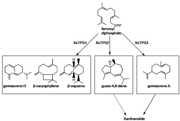 中国科学院植物种质创新与特色农业重点实验室天然药物生物合成学科组博士研究生李缘君在章焰生研究员的指导下,以湖北武汉和贵州遵义的苍耳为研究材料,分别建立了不同化学型苍耳叶片及苍耳腺毛(苍耳中倍半萜内酯合成和贮存的器官为表面的球状腺毛)的转录组数据库,通过比较转录组学研究,筛选并克隆了3条倍半萜合成途径上的倍半萜合酶基因(XsTPS1-3),并进行了功能分析。研究结果显示XsTPS1主要催化合成germacrene D,XsTPS2催化生成guaia-4,6-diene,XsTPS3生成germacrene A;而且苍耳中的XsTPS3的基因表达特性与其倍半萜内酯积累特性高度相关,可证明其参与了苍耳中倍半萜内酯的生物合成。该研究对倍半萜合酶基因的挖掘将为解析倍半萜物质的生物合成路径提供了分子证据,也为运用合成生物学技术规模化合成特异倍半萜提供了必要的基因元件。此外,在章焰生研究员的带领下,武汉植物园天然药物组与加拿大卡尔加里大学建立了合作关系,双方就倍半萜内酯合成下游关键酶基因挖掘的后续研究展开了合作,有望在不久的将来揭开倍半萜药物合成的神秘面纱。