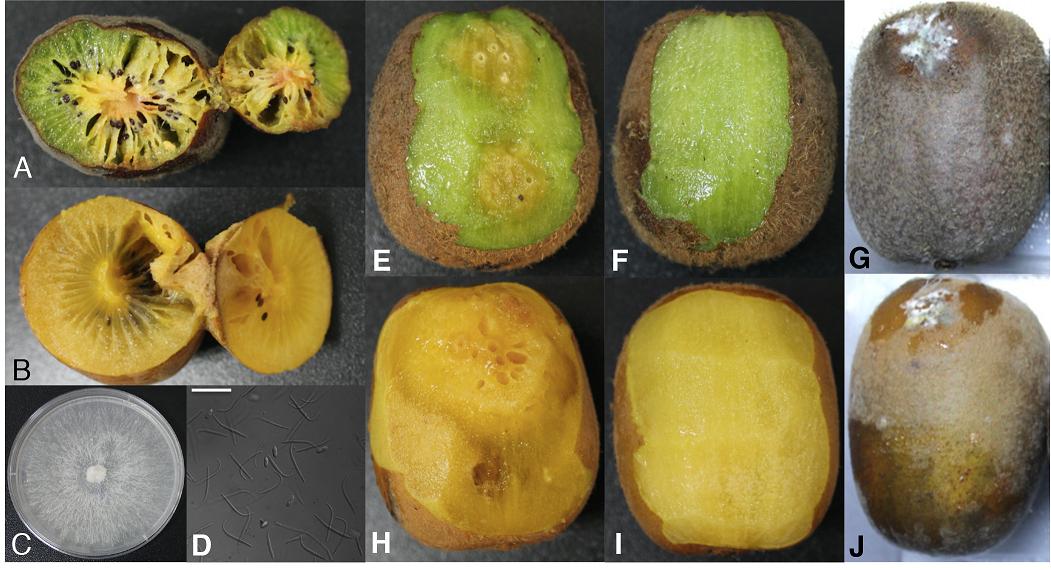 目前国内外已报告为猕猴桃软腐病致病菌的拟茎点霉菌种类有Diaporthe. actinidiae,D.ambigua, Phomopsismali, Phomopsisvaccinii,D.novem, D.lithocarpu,D. australafricana 及D. viticola 等。其中D. actinidiae 菌株,1975年首次被鉴定为新西兰猕猴桃软腐病的致病菌;1982年被鉴定为新西兰猕猴桃软腐病的主要致病菌;随后,该菌株分别在意大利、美国、韩国、西班牙及葡萄牙的西北地区发现,但一直未曾在中国境内被鉴定到。最近,经过多次实验分析验证,李黎首次在中国湖南及湖北省的猕猴桃软腐病感病果实上分离并鉴定到了Diaporthe. actinidiae 病原菌。同时,在陕西、湖北及四川的猕猴桃软腐病感病果实上,首次鉴定到曾报道仅会引起猕猴桃果实霉变的Alternaria alternate 菌株,证实该菌株在适合的条件下也会引起猕猴桃果实软腐病的发生。研究成果已分别在Plant Disease 在线发表。