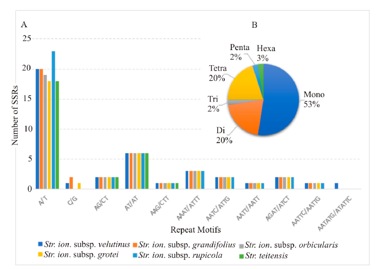 当前,在海角苣苔属Saintpaulia组中仅有一个叶绿体基因组数据被报道,未见到该组中Str. ionanthus的基因组数据信息,重点实验室博士研究生Cornelius Mulili Kyalo对收集于坦桑尼亚和肯尼亚的Str. ionanthus的五个亚种进行了叶绿体全基因组测序,分别为Str. ionanthus subsp. rupicola,Str. ionanthus subsp. velutinus,Str. ionanthus subsp. grandifolius,Str. ionanthus subsp. orbicularis,Str. ionanthus subsp. grotei,其基因组大小从153,208 bp(Str. ionanthus subsp. grandifolius)到 153,377 bp(Str. ionanthus subsp. orbicularis),均编码115个基因。该研究与Saintpaulia组已报道的Str. teitensis进行比较结果显示,基因的排列顺序,基因组结构均表现出高度保守性,在四分结构中,IR区更为保守(图 1)。研究通过IR边界,以及序列上的微卫星(图 2)等方面的比较,均表现出叶绿体基因组的保守性。