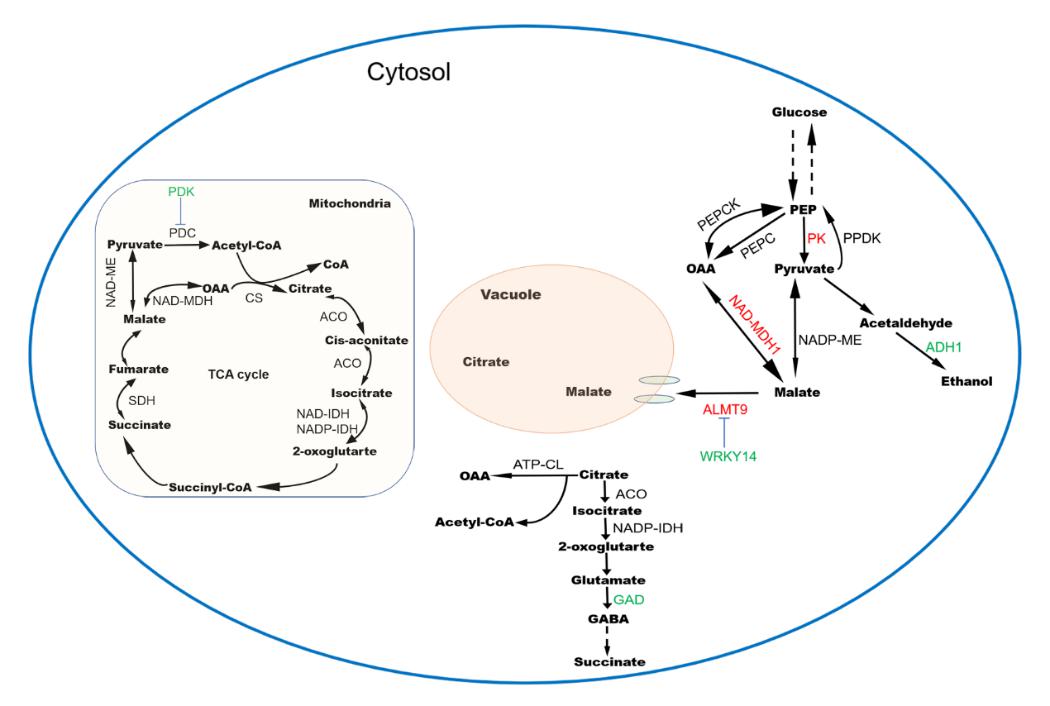 中国科学院植物种质创新与特色农业重点实验室果树分子育种学科组科研人员通过对桃资源成熟果实有机酸组分与含量测定发现,桃果实有机酸主要包含苹果酸和柠檬酸,少数品种奎尼酸也较高;桃果实发育早期大量积累有机酸,但果实成熟期有机酸含量显著下降导致了低酸性状的形成。在低酸品种果实发育后期,γ-氨基丁酸(GABA)合成限速酶——谷氨酸脱羧酶基因(GAD)的表达水平上升促进了柠檬酸降解(下图)同时,丙酮酸脱氢酶激酶基因(PDK)和丙酮酸激酶基因(PK)的上调表达以及乙醇脱氢酶基因(ADH1)的下调表达也可能通过“丙酮-乙酰辅酶A-柠檬酸途径”影响柠檬酸的合成。而促进苹果酸向液泡转运的苹果酸转运体基因ALMT9显著下调表达。相反,在高酸品种果实发育后期,苹果酸合成途径中的限速酶编码基因NAD-MDH1表达显著上调,同时伴随苹果酸转运体基因ALMT9的激活,促进苹果酸大量积累并最终导致果实酸化,但在低酸品种中ALMT9基因表达受到了负调节基因WRKY14的抑制,导致苹果酸积累的下降。综上所述,桃果实中苹果酸的积累与代谢和液泡贮运有关,而柠檬酸的积累主要由代谢决定。