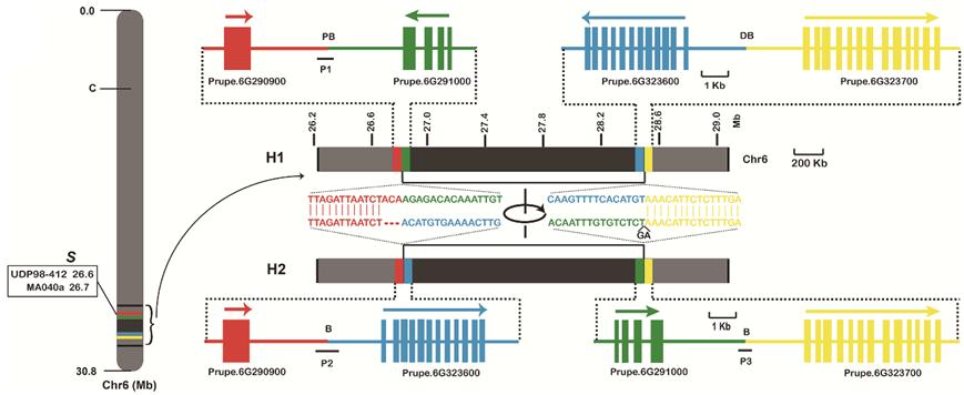 蟠桃扁平果形受位于第6号染色体上S位点的单基因控制,但其遗传机理尚不清楚。中国科学院植物种质创新与特色农业重点实验室果树分子育种学科组科研人员在韩月彭研究员带领下研究发现S位点下游1.7 Mb大片段DNA的位置颠倒(染色体倒位)是导致桃扁平果形成的遗传基础(下图)。对727个桃品种进行基因分型,结果表明这种大片段的染色体倒位现象只出现在蟠桃中,但未在圆桃中发现。倒位的近端断点和远端断点分别包含三个碱基的缺失和两个碱基的插入,这暗示该染色体倒位是染色体双链断裂后经非同源末端连接(NHEJ)途径形成的错误连接。倒位近端断点上游3.1 Kb处有一个编码卵形家族蛋白基因PpOFP1,该基因在桃果实发育早期高水平表达会抑制果实的垂直伸长,导致扁平果形的形成,反之,低水平或不表达则形成圆形果。除PpOFP1外,促进果实伸长的PpTRM17等基因可能也参与桃果形发育形成一个基因调控网络。此外,对桃野生近缘种S位点进行基因分型发现,染色体倒位现象只存在于新疆桃,但未在光核桃、甘肃桃和山桃等野生资源中发现,该结果不仅证实了蟠桃起源于中国,而且为“新疆是栽培桃驯化起源地”这一推论提供了证据。