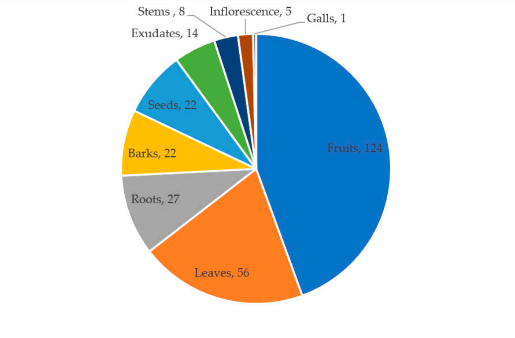 2019年,中非联合调查组基于在肯尼亚Kitui县野外调查期间采集的标本和东非植物标本馆中馆藏的标本,结合该县植物相关的文献报道,对该县的维管植物名录进行整理,最终梳理出一份含931种维管植物的名录。近期,该小组从肯尼亚野生食用植物相关的文献报道及在Kitui县开展的野外调查结果中,整理了该县的野生食用植物名录。调查结果显示,Kitui县共有野生食用植物199种,隶属52科114属,它们具有不同的食用用途,如用作水果、蔬菜、药茶、调味剂、淀粉食品、种子食品、树脂树胶等。研究表明,乔灌木及草本植物是野生食用植物主要的生活型,其中最具代表性的科是豆科和锦葵科。此外,果实和叶子是植物常见的可食用部位,而水果和蔬菜则是Kitui县常见的野生植物食物类型。
