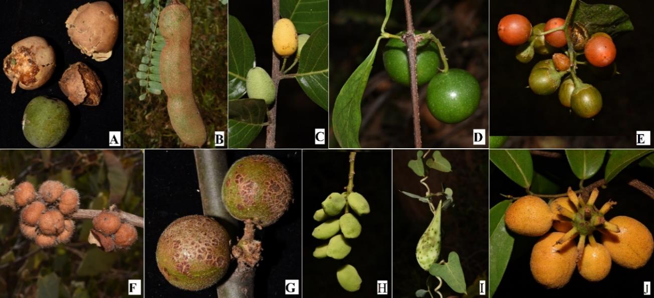 (A) Balanites aegyptiaca (L.) Delile (Zygophyllaceae); (B) Tamarindus indica L. (Leguminosae); (C) Berchemia discolor (Klotzsch) Hemsl. (Rhamnaceae); (D) Vangueria madagascariensis J.F.Gmel. (Rubiaceae); (E) Cordia sinensis Lam. (Boraginaceae); (F) Grewia villosa Willd. (Malvaceae); (G) Commiphora edulis (Klotzsch) Engl. (Burseraceae); (H) Lannea schweinfurthii Engl. (Anacardiaceae); (I) Cynanchum hastifolium K.Schum. (Apocynaceae); (J) Uvaria scheffleri Diels (Annonaceae).