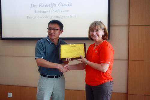 5月21号上午,应果树分子育种学学科组韩月彭研究员的邀请,美国克莱姆森大学Ksenija Gasic博士到重点实验室进行学术交流,并做了题名为“Peach breeding program at clemson university”的学术讲座。