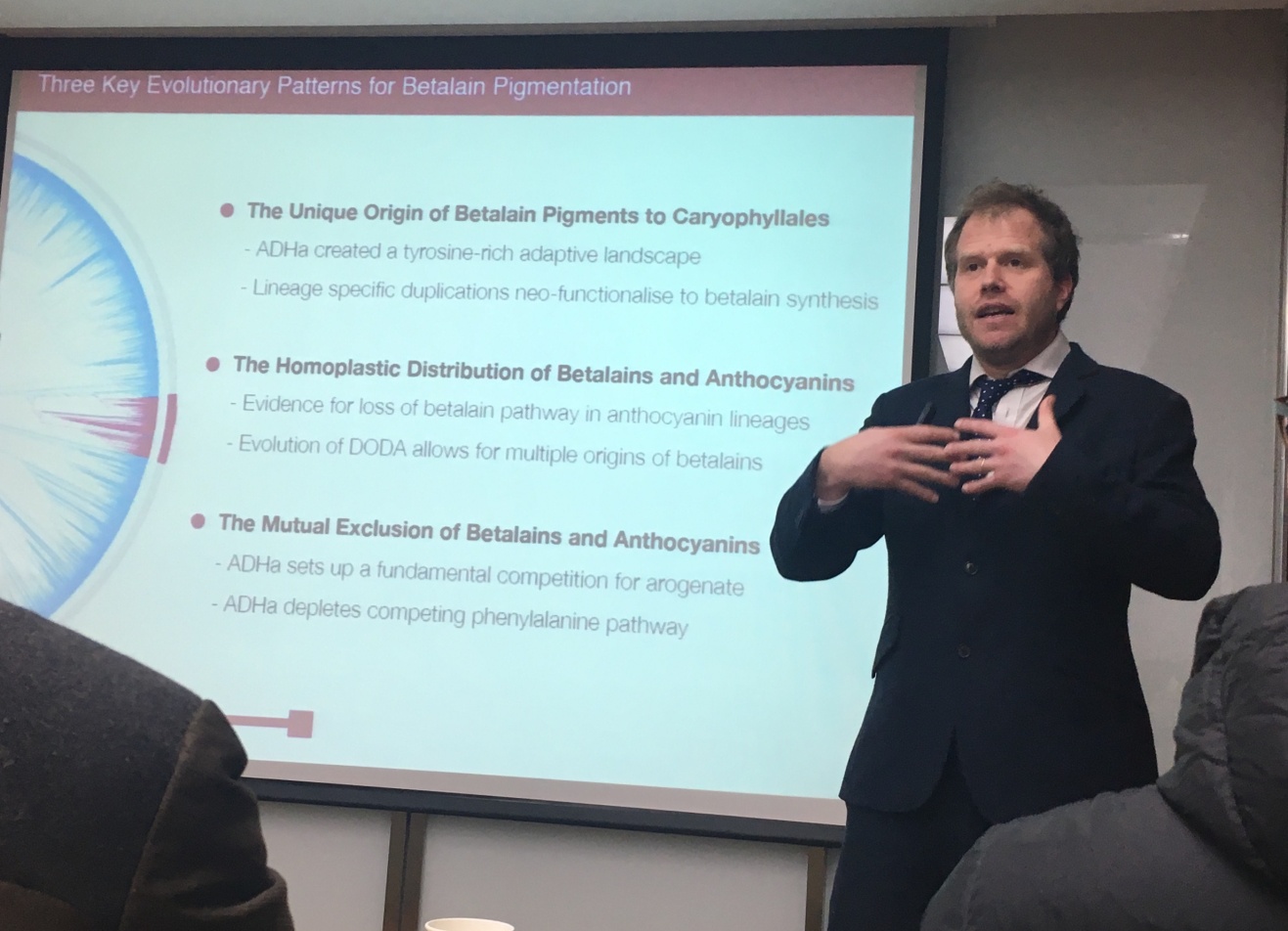 Brokington博士以“植物色素甜菜碱的起源进化机制”为题,详细介绍了石竹目的核心类群中花青素缺失而代之以甜菜素来行使呈色功能机制;解析了甜菜素合成通路的关键酶的进化,以及花青素代谢基因的假基因化及丢失等重要理论问题,同时介绍了主要阶段性成果及未来合作前景。报告结束后,Brokington与师生就相关领域内的学术问题进行了热烈讨论,并就合作研究等问题进行探讨和展望。现场气氛活跃,报告受到广大师生的一致好评。