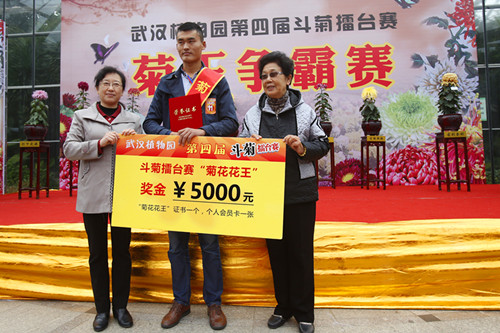 擂台上,十二位选手自荐品种,比拼技艺,好不热闹。经过激烈的比拼,最终,‘古刹金刚’养护者,年轻的养菊新手周广坤摘下“菊花花王”桂冠,获得5000元的奖金鼓励。‘古刹金刚’为平瓣球形花,它的泥金色是菊花里少有的颜色,花朵既茁壮又舒展,叶片均匀长势良好,花期控制的也非常完美”,张树林等评委给予‘古刹金刚’高度评价。去年的武汉“菊花花王”张三军今年带着“紫十八”来打擂,他送选的“紫十八”花瓣挺立,叶形均匀舒展,以微弱之差惜败“菊花花王”,成为“菊花状元”的获得者,荣获奖金3000元。南通市城乡建设局送选的“古韵新貌”获得“菊花榜眼”,获得奖金2000元。武汉品种“盘龙媚娘”的养护者曾晓和囊获“菊花探花”,获得奖金1000元。开封市汴京公园、天津水上公园等单位,以及武汉的刘庆东等人获得了奖金500元和武汉市“养菊能手”的称号。