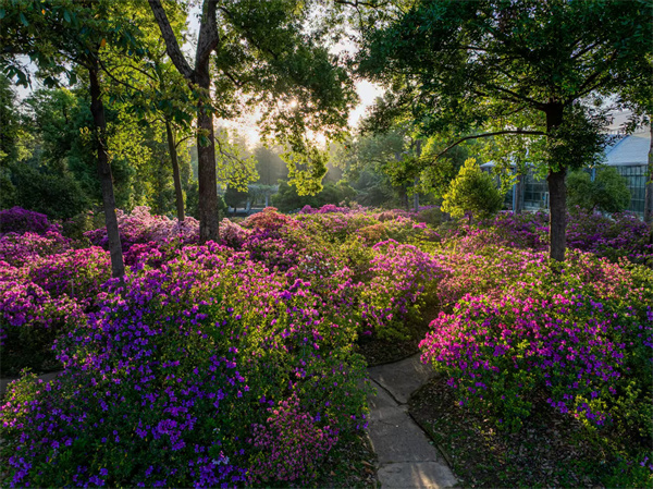 春风将武汉植物园荡漾翠绿的山林吹成漫天嫣红,杜鹃花儿浩浩荡荡地蔓延开来,似燃烧的花火,热烈又浪漫。武汉植物园按照一园多线的布局来打造杜鹃景观。杜鹃园模拟野生杜鹃生境,依据坡地落差分类种植亚高山类杜鹃,还原亚高山杜鹃层林红遍繁花似锦的景况。此时,大片大片的杜鹃灿然开放、映山红遍,浪漫直击心田。走进杜鹃园,一团团一簇簇的杜鹃沿着小径逶迤绵延,指引人走进繁花深处。蜿蜒的小径边各色杜鹃次第开放,人在路上走,更在花下游。一些高大的乔木在为杜鹃遮蔽骄阳的同时,也带来了密林掩映的美感。