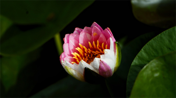 “粉色黎明”也曾获得IWGS最佳耐寒睡莲品种的称号。“粉色黎明”则是粉白两色随机配色 ,花瓣略带斑点,姿态舒展,在一池的波光潋滟中显得娇俏动人。其中一朵“粉色黎明”粉白两色平分花瓣,花色泾渭分明,宛若“水上佳人”清新灵动。