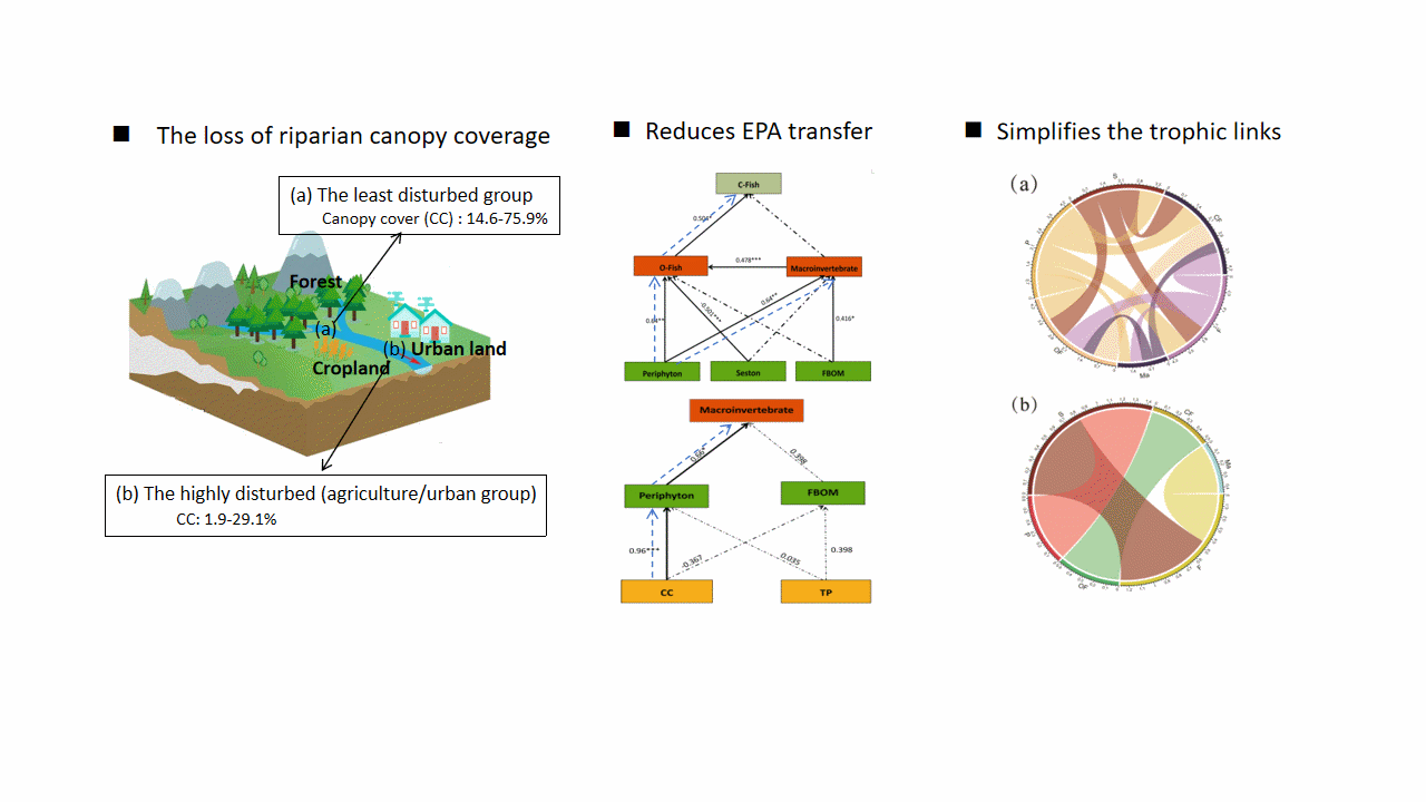 研究成果以“Loss of riparian canopy cover reduces the transfer of polyunsaturated fatty acid (PUFA) and simplifies the trophic links in stream food webs”为题发表于Water Research。研究受到了国家自然科学基金(Nos. 32271665, 32030069)的资助。