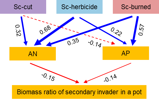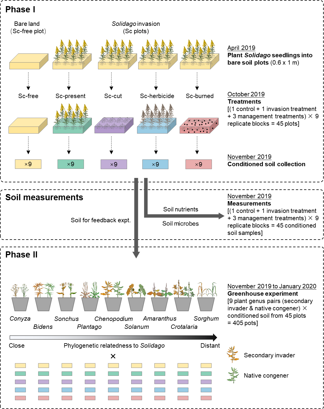 外来植物入侵是导致生物多样性降低和生态系统服务功能丧失的重要原因。鉴于此,世界各地开展了大量入侵植物治理项目。入侵植物的有效治理不仅要减少目标植物的数量和分布,同时还需提高本地植物多样性,恢复生态系统原有功能。入侵植物会改变入侵地土壤理化性质、微生物群落结构等,这些改变的土壤性质在入侵植物防治后会产生持久的土壤遗留效应,促进其他入侵植物的定殖与扩散,进而发生继发入侵,阻碍本地生态恢复。然而,土壤遗留效应并不完全由目标入侵植物决定,入侵植物治理过程中采取的各种防治措施往往会影响土壤理化性质和微生物群落。目前,入侵植物土壤遗留效应如何驱动继发入侵以及防治措施是否调控土壤遗留效应进而影响继发入侵,我们还知之甚少。