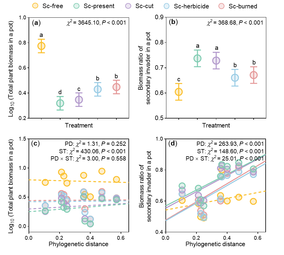 图2. 防治措施及系统发育相关性影响植物生长和继发入侵